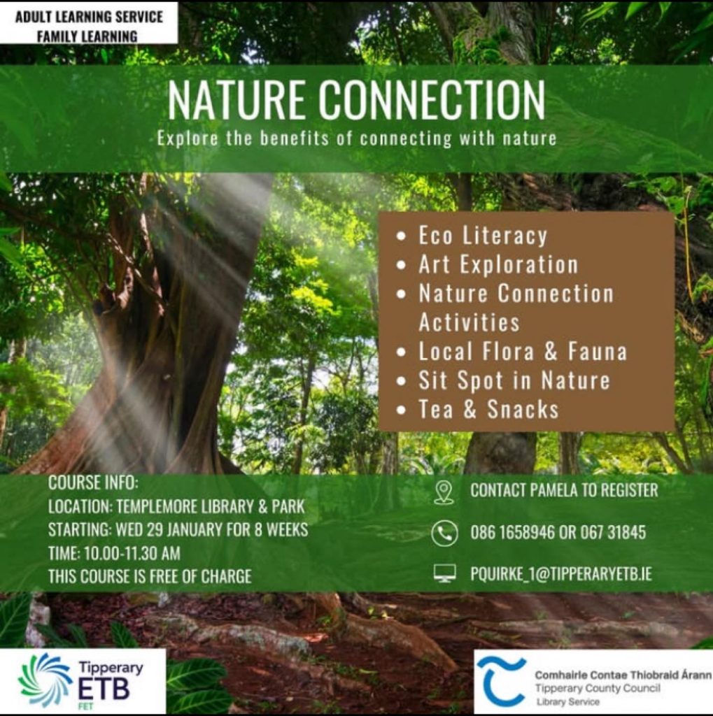 Join us for an 8-week course designed to help you explore the benefits of connecting with nature. Hosted by Tipperary ETB in collaboration with Tipperary County Council Library Service, this course will take place in Templemore Library & Park and is completely free of charge.